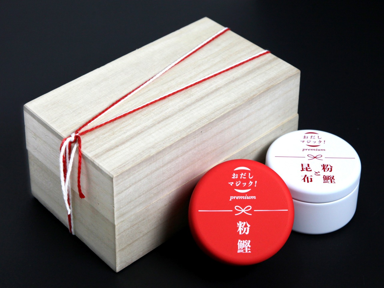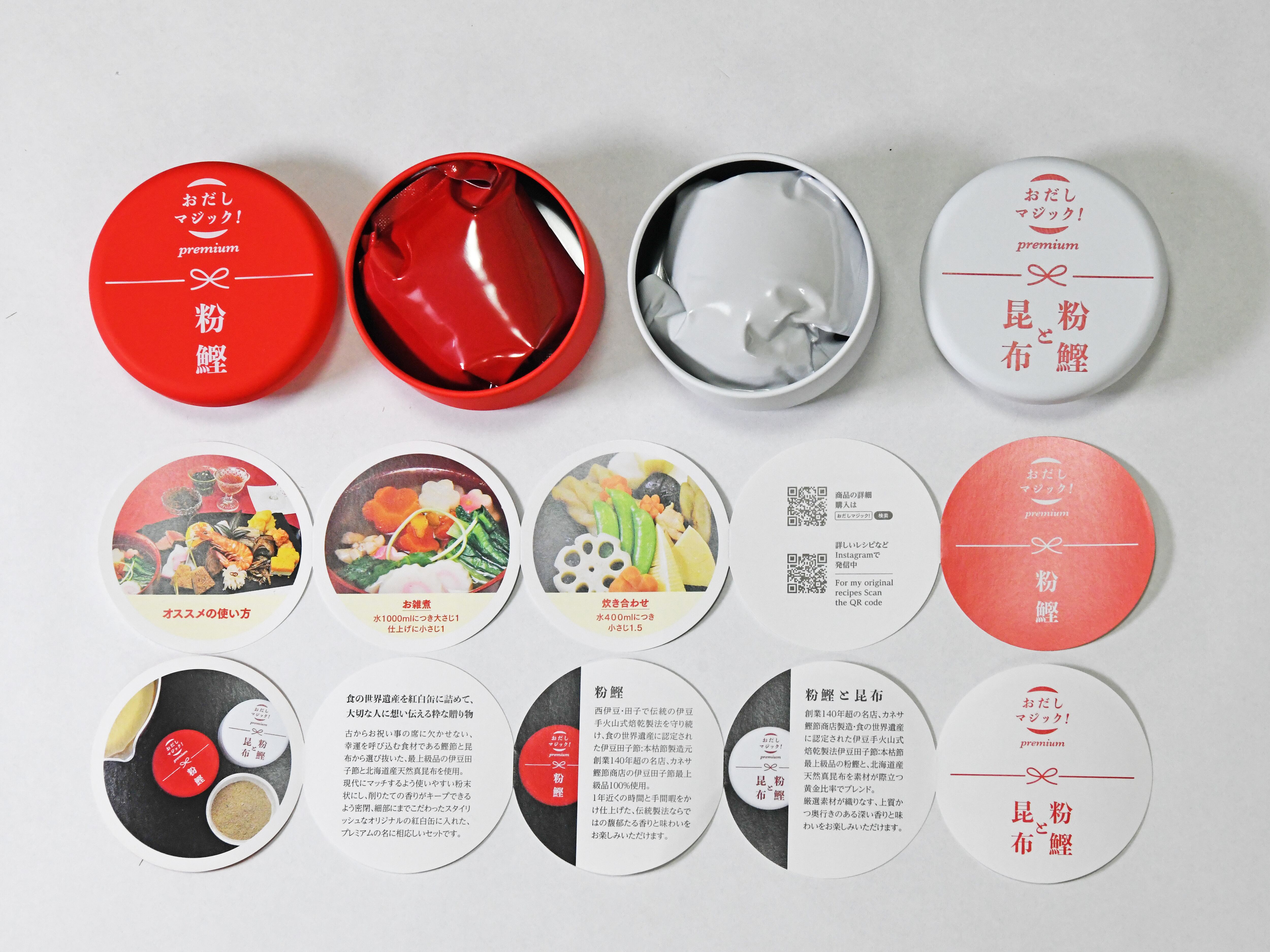選び抜いた伝統食材を、現代の暮らしに合わせ使いやすい粉末に加工し、削りたての香りを閉じ込める密封仕様の袋に詰め、細部にまでこだわった紅白のスタイリッシュなオリジナル缶に入れ、さらに格調高い桐箱に収めました。